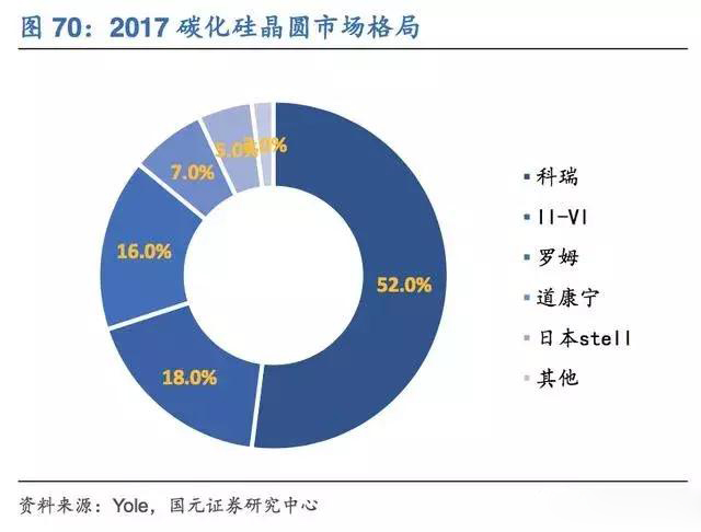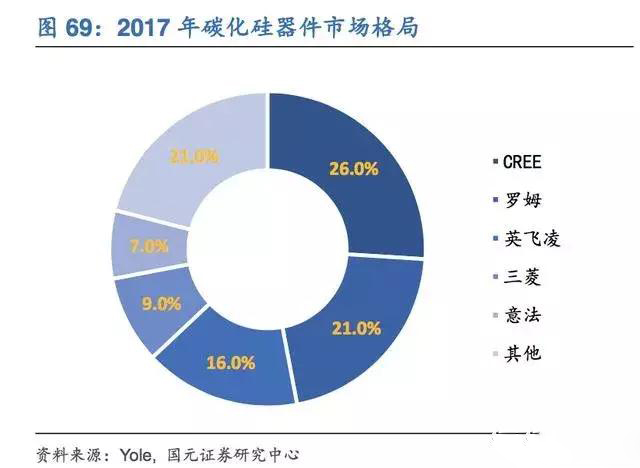 罗姆半导体从2000年开始对碳化硅技术的研究,并在2009年收购了SiCrystal;英飞凌拥有雄厚的资本优势,这导致目前碳化硅市场主要由这三家把控。而碳化硅晶圆市场,则更是几乎由科瑞、罗姆半导体、II-VI国际公司垄断。