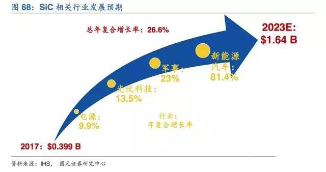 作为第三代半导体的代表材料,碳化硅市场发展迅速。据IHS数据,2017年的碳化硅市场总量为3.99亿美元,而在2023年将会达到16.44亿美元,年复合增长率达到26.6%。其中,发展最大的是新能源汽车领域,年复合增长率达到了惊人的81.4%。