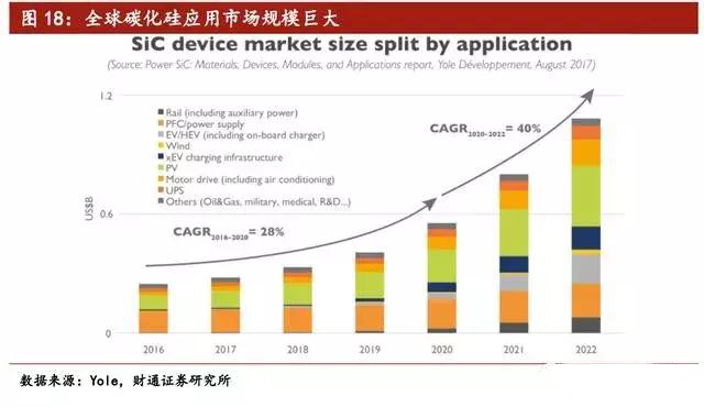 根据法国知名电子供应链市场研究机构Yole数据,预计到2020年全球SiC应用市场规模将达到5亿美元,而到2022年市场规模将会进一步达到10亿美元,其中2016-20年的复合增速为28%,同时随着下游电动车产业驱动,2020-22年的复合增速将达到40%。