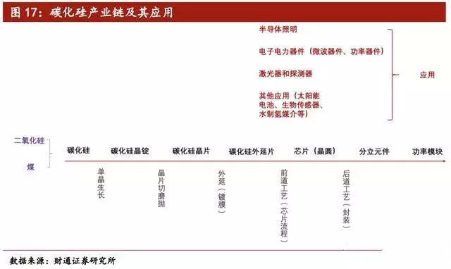 碳化硅半导体的完整产业链包括:碳化硅-晶锭-衬底-外延-芯片-器件-模块,其下游应用包括半导体照明、电子电力器件、激光器和探测仪以及其他应用。