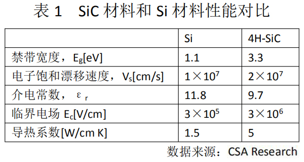 (1)SiC材料和Si材料性能比较。基于宽禁带材料制造的电力电子器件具有 Si 器件无法相比的电气性能。SiC材料禁带宽度是Si的3倍左右:SiC器件能够承受更高的工作温度和较高的工作电压;SiC材料具有更高的电子饱和漂移速度:电子饱和漂移速度与最终元件的开关性能有关,参数越高,器件的最大开关频率越高,开关损耗频率越小,如SiC广泛应用于音频放大器中;临界电场越高,承受的击穿电压越高,这是SiC广泛应用于高铁、电网等领域的原因;更高的导热系数可以使宽禁带电源开关以更安全的方式达到更高的温度。SiC材料和Si材料性能对比如表1所示。