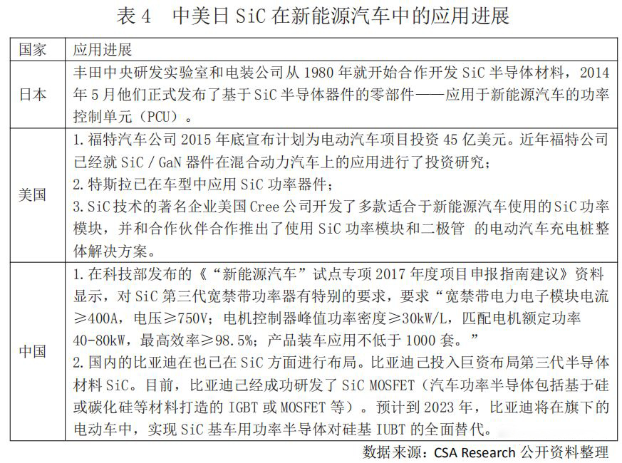 在SiC应用于电动汽车方面,SiC肖特基二极管器件已经广泛应用于高端电源市场,包括PFC、光伏逆变器和高端家电变频器。以SiC的龙头企业美国科锐、德国英飞凌、日本罗姆等半导体巨头公司为代表的功率器件公司逐步推出SiC金属一氧化物半导体场效应晶体管(MOSFET)、双极结型晶体管(BJT)、结型场效应管(JFET)、绝缘栅双极型晶体管(IGBT)产品。其中日本企业在SiC应用推广上更加积极,不断推出SiC二极管和MOSFET的功率模块,并在电动汽车和轨道交通上不断进行应用研究,目前已经取得了明显的成就。