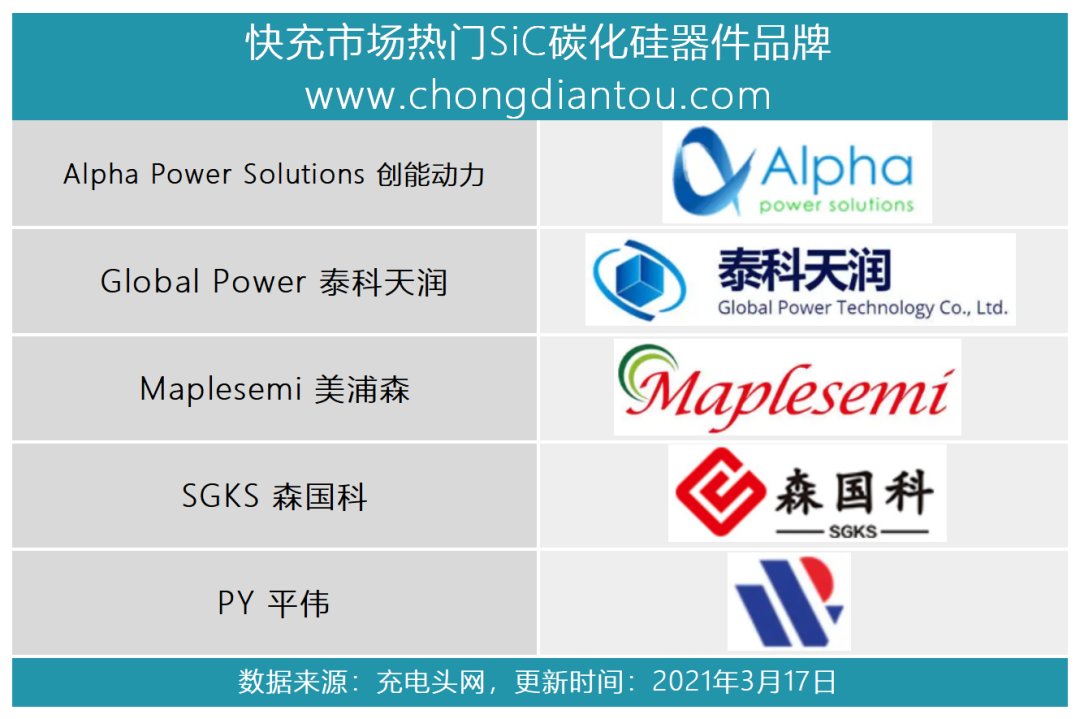充电头网通过调研了解到,目前市面上可用于大功率USB PD快充电源领域的碳化硅有五家供应商,分别是Alpha Power Solutions创能动力、Global PowerK8一触即发人生赢家、Maplesemi美浦森、SGKS森国科以及PY平伟。