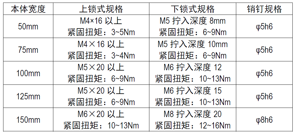 (4) 单轴机械手安装螺钉紧固扭矩参考值